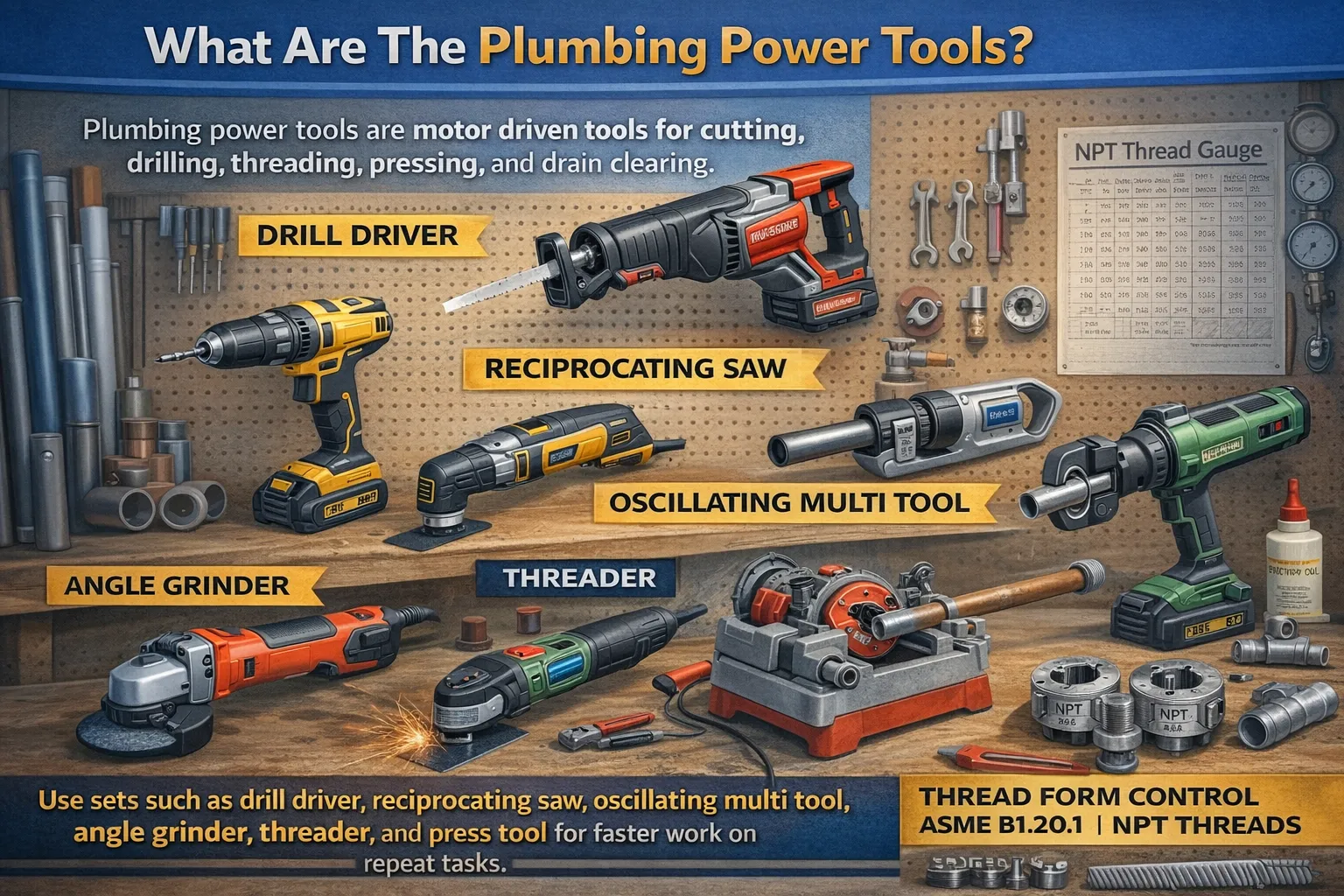 Plumbing power tools are motor driven tools for cutting, drilling, threading, pressing, and drain clearing.