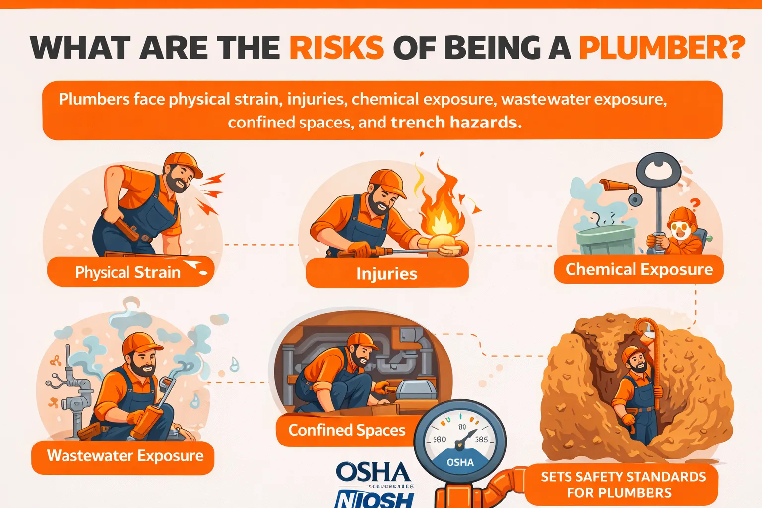 Risks of being a plumber include physical strain, tool injuries, chemical exposure, wastewater exposure, confined-space hazards, and trench hazards.